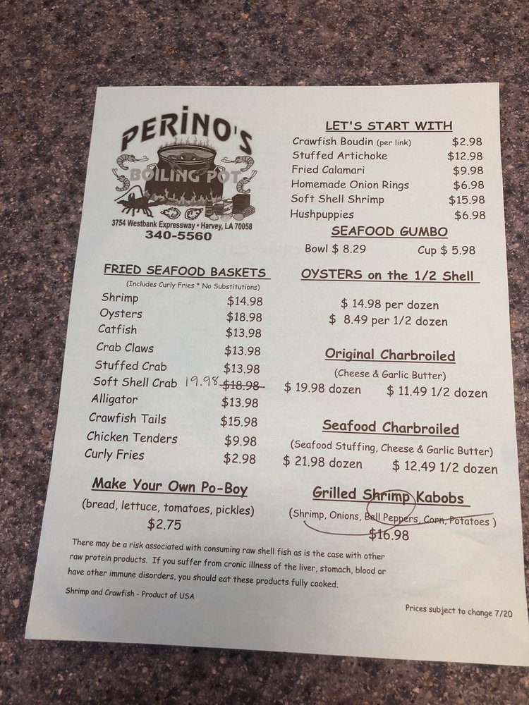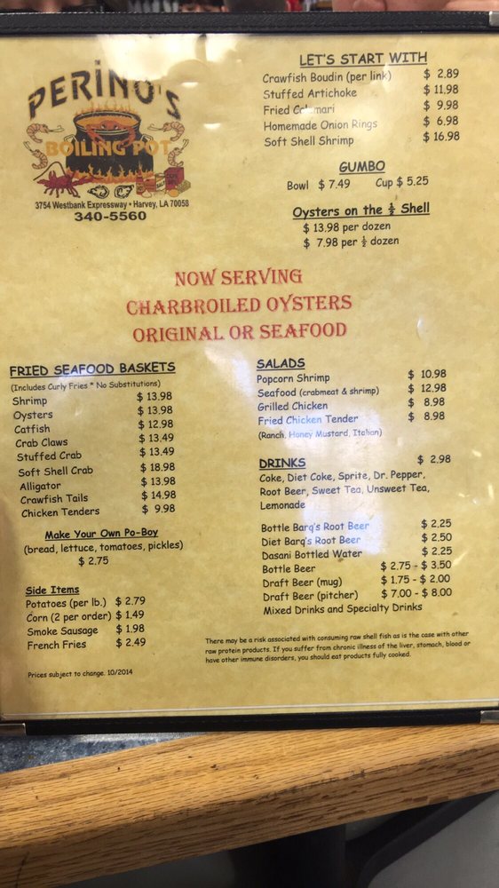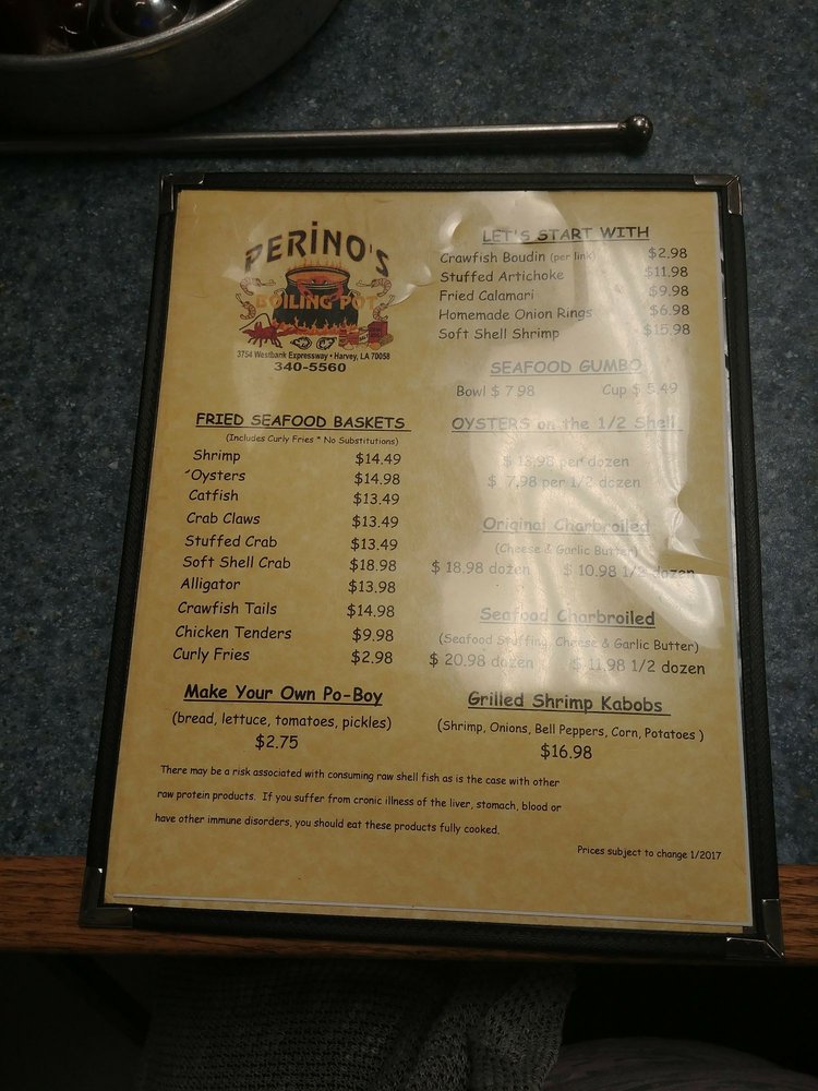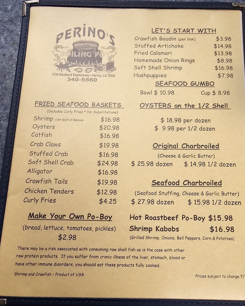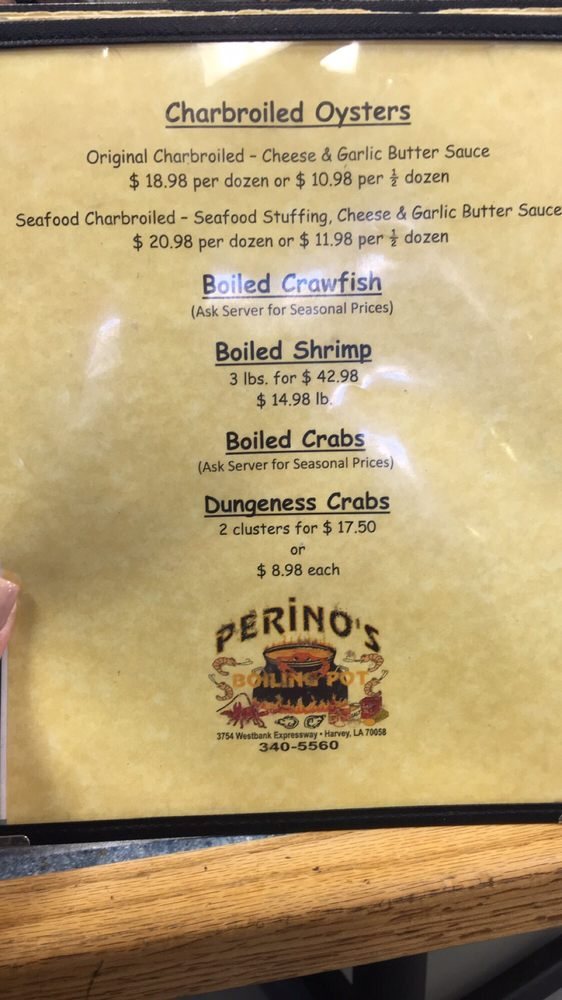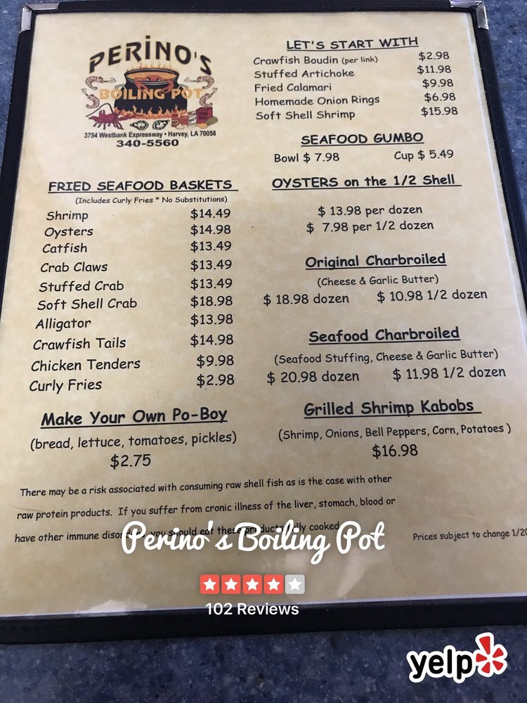 Perino's Boiling Pot is a seafood restaurant located in Harvey, LA, offering a variety of options for seafood lovers. With amenities like takeout, reservations, delivery, and vegetarian options, this casual dining spot caters to a wide range of preferences. The restaurant features a full bar, outdoor seating, and TV, making it a great place to unwind with friends and family. Whether you're looking for a spot for lunch, dinner, or a group gathering, Perino's Boiling Pot has you covered. The menu highlights fresh seafood dishes that are sure to satisfy your cravings. Don't miss out on this gem in the Harvey area for a delightful seafood dining experience.